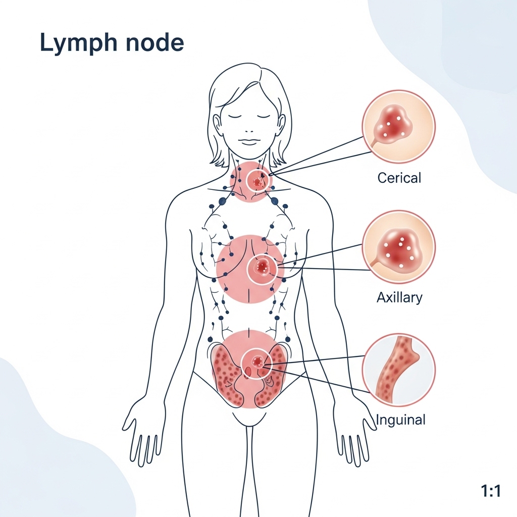목 양옆, 쇄골 위, 겨드랑이, 사타구니 등에서 콩알 크기 이상의 덩어리가 만져진다면 림프절 비대를 의심해볼 수 있습니다. 림프종의 경우 통증 없는 림프절 종창이 가장 흔한 첫 증상입니다. 단단하고 고정되어 있으며, 3주가 지나도 크기가 줄지 않으면 반드시 검사를 받아보셔야 합니다.